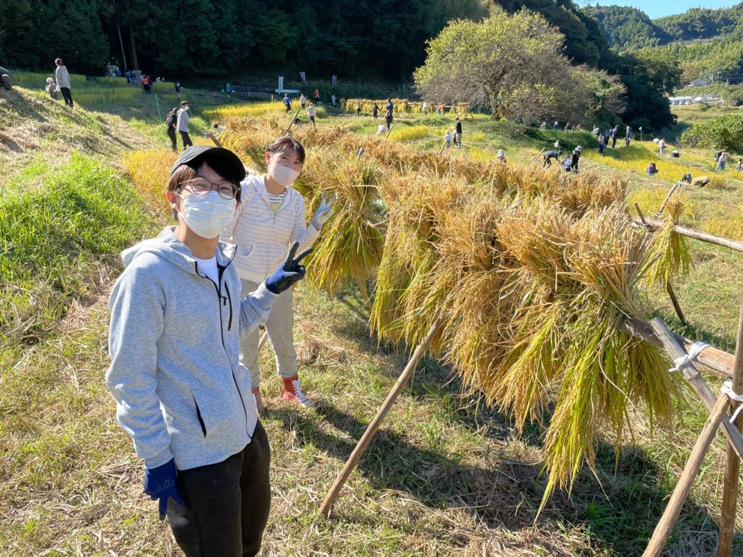 私自身稲刈りが初めてであり、小学生の時にバケツで稲を育てたくらいでしたので、とても新鮮な経験でした。